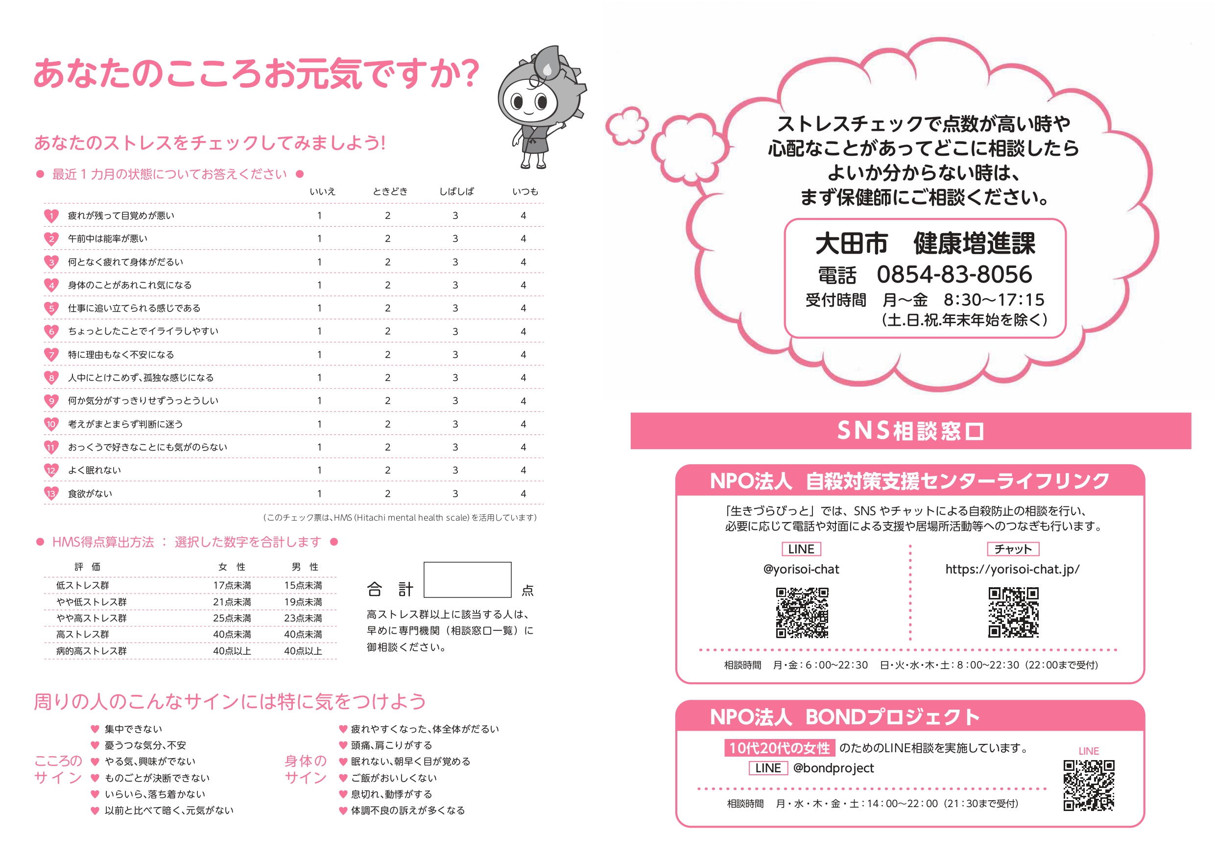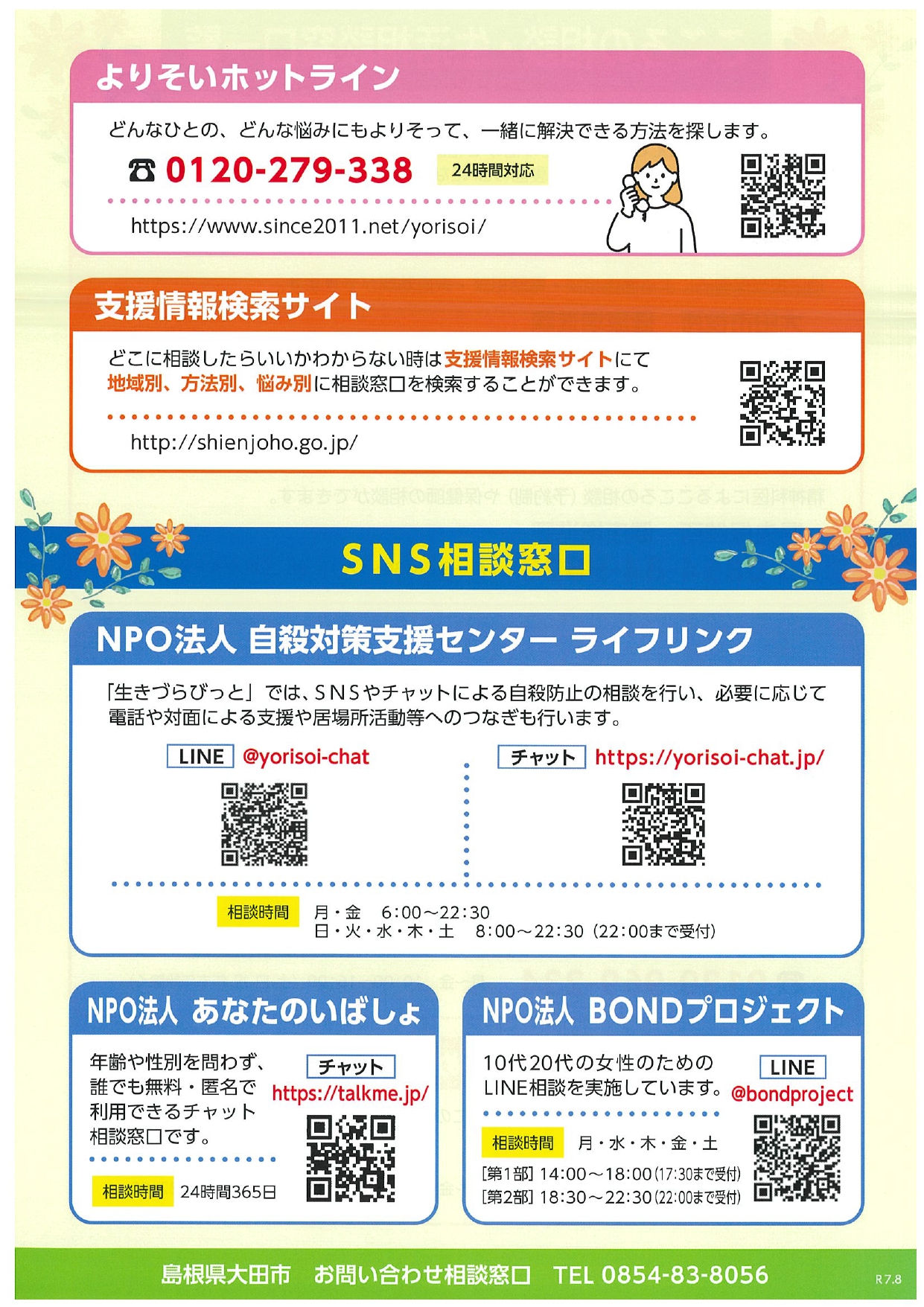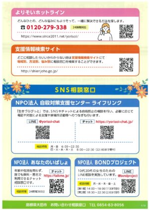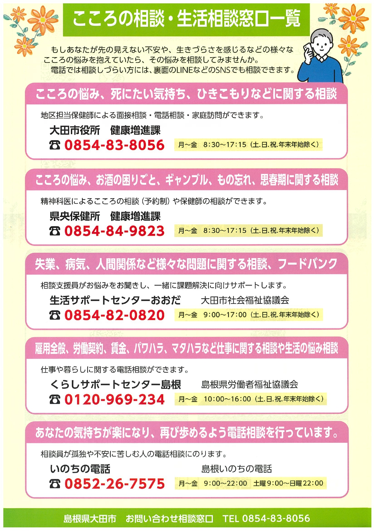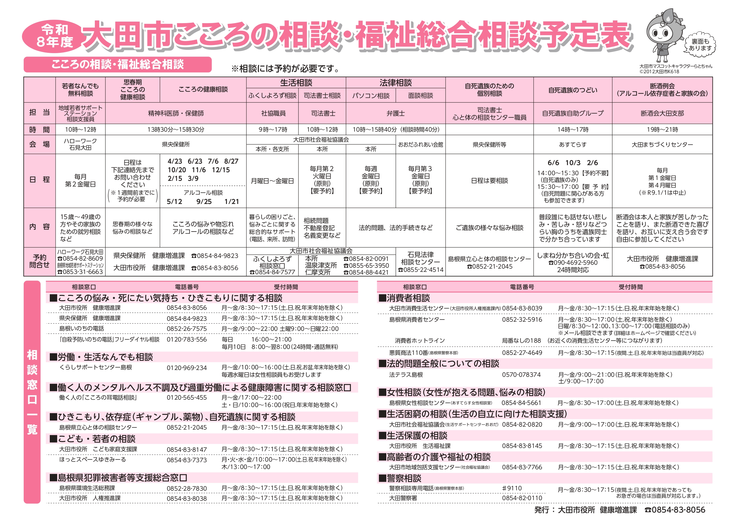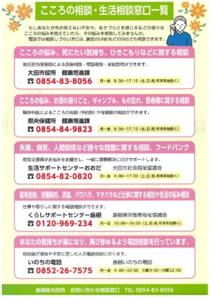 NEW 2026-03-19 R8年度大田市こころの相談・福祉総合相談予定表【大田市役所より】 大田市役所より【R8年度大田市こころの相談・福祉総合相談予定表及びこころの相談・生活相談窓口一覧】のお知らせです。